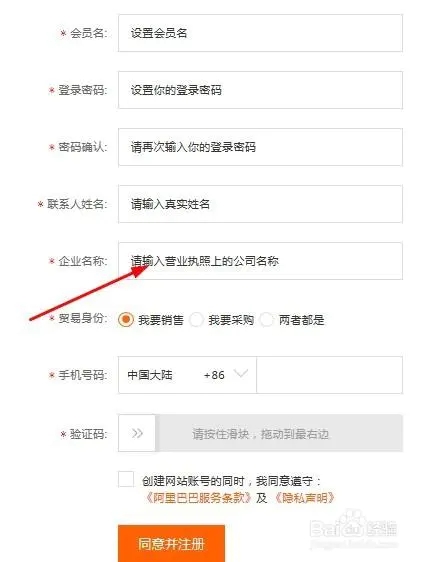 第三步:我們以企業(yè)賬戶注冊(cè)為例,填寫賬戶信息:用戶名、登錄密碼、聯(lián)系人姓名、企業(yè)名稱;選擇貿(mào)易身份:銷售/采購/二者都是;輸入手機(jī)號(hào)碼和驗(yàn)證碼,點(diǎn)擊同意并注冊(cè)。